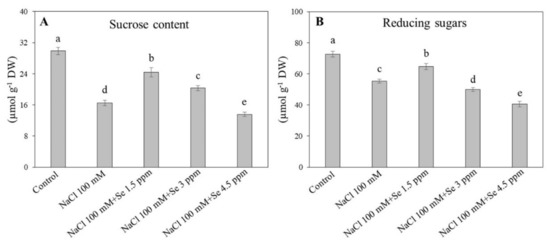 Effect of selenium (Se) fertilization on (A) sucrose content and (B) reducing sugars in leaves of black gram plants under salt stress. Values are mean ± standard error (n = 3). Different letters in vertical columns show a significant difference. A comparison of mean was confirmed by LSD at p < 0.05.