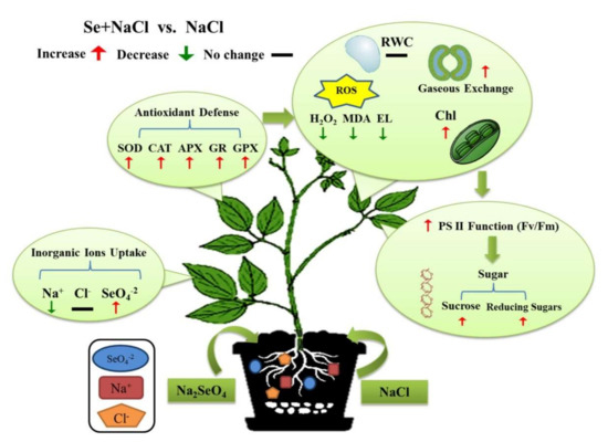 Nutrient amelioration has been proposed to mitigate the harmful impacts of salt toxicity in plants [14]. However, these studies have mainly targeted potassium [15,16], calcium [17,18], and phosphorus [16]. Se is an important micronutrient for human beings and livestock [19,20]. A deficiency of Se is responsible for asthma, hypothyroidism, and weakened immune systems in humans [21,22]. The positive effects of Se on plants are concentration or species dependent. Plants are very sensitive to Se (the trace concentration), and higher amounts (>400 µg Sed−1) have proven to be drastic and even lethal for plants [23,24]. Due to similar properties, Se and sulphur (S) are absorbed by plants through sulphate transporters and assimilated by the sulfur assimilating pathway [25,26]. Some studies have reported that Se induced beneficial effects on different physiological processes of plants such as improvement in stress tolerance [27] and photosynthesis [28], and alleviation of senescence [29,30]. Previously, if has been shown that Se considerably improved plant growth and physiochemical attributes under salt stress. However, the putative role of Se was dose dependent and varied with its concentration, duration of application, and plant species at different growth stages [31]. The application of Se has enhanced carbohydrate content in the leaves of beans (Phaseolus vulgaris) [32] and promoted plant growth and soluble sugar content in coffee (Coffea arabica) leaves [33]. Foliar application of Se has increased the quantity and quality of green tea (Camellia sinensis) leaves [34]. Se fertilization as selenite to potato tubers has increased protein content and reduced glycoalkaloids, and NO3− accumulation [35]. The accumulation of more starch grains and growth improvement have been observed in lettuce plants treated with Se [36]. Se-treated mung bean have also been shown to accumulate more sucrose and starch [37]. For stress tolerance, minute quantities of Se have improved antioxidant enzyme activities and growth during senescence and ultraviolet radiations in lettuce (Lactuca sativa) and ryegrass (Lolium perenne) [29,38,39]. The application of Se could mitigate the light-induced oxidative damage in potato (Solanum tuberosum) [40].