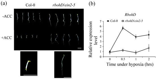 The induction of H2O2 and levels of AtERF73/HRE1 and ADH1 are reduced in rbohD and ein2-5 single mutants under hypoxic stress [19,26]. To further investigate the interplay of ethylene and H2O2 signaling during hypoxia, we obtained rbohD/ein2-5 double mutant lines by crossing single rbohD and ein2-5 homozygous mutants. After seeds were grown on 1/2 strength Murashige and Skoog (MS) medium with or without 1-aminocyclopropane-1-carboxylic acid (ACC) treatment for 4 d in dark conditions, the etiolated seedlings of the rbohD/ein2-5 double mutant line did not exhibit the triple response (Figure 1a). Increased RbohD transcript levels were not induced in the rbohD/ein2-5 double mutant line after hypoxic treatment (Figure 1b).