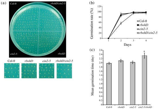 The rbohD/ein2-5 double mutant seeds germinated more slowly than wild-type, rbohD, and ein2-5 single mutants under normaxic conditions; 90%, 85%, and 91% of wild-type, rbohD, and ein2-5 single mutant seeds germinated after 2 d, whereas only 56% of rbohD/ein2-5 double mutant seeds germinated. Germination was largely completed after 3 d incubation (Figure 2a,b). The mean germination time of seeds from wild-type, rbohD and ein2-5 single mutants, and that from the rbohD/ein2-5 double mutant, was 1.98, 2.10, 2.03, and 2.35 d, respectively (Figure 2c).