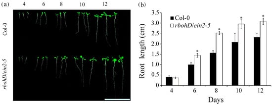 Comparison of root growth in wild-type and rbohD/ein2-5 double mutant seedlings. (a) Phenotypes of seedlings grown on 1/2 MS medium for 4, 6, 8, 10, and 12 d. Bar = 2 cm. (b) Average root length of seedlings grown on 1/2 MS. Error bars represent SD of 100 seedlings of each genotype, obtained from three biologically independent experiments. * p < 0.05, versus wild-type (Student’s t test).