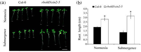 Ethylene plays a role in inhibiting root length during plant developmental processes. Hydrogen peroxide also functions in inhibiting root length [27,28]. To determine whether ethylene signaling and H2O2 affect root growth in response to submergence, 7-day-old wild-type and rbohD/ein2-5 double mutant seedlings were treated with normoxic or submerged conditions for 7 d. Root lengths were significantly reduced in wild-type plants compared with the rbohD/ein2-5 double mutant lines (Figure 4a). The average root lengths of wild-type and the rbohD/ein2-5 double mutant under the normaxic condition were 1.94 and 2.83 cm, respectively, whereas the average root lengths of wild-type and the rbohD/ein2-5 double mutant under submergence were 1.34 and 3.19 cm, respectively (Figure 4b). The root lengths of the rbohD/ein2-5 double mutant increased by 113% under submerged conditions compared with under the normaxic condition, whereas those of wild-type plants decreased by 69%. These results indicate that root growth was not inhibited in submerged rbohD/ein2-5 double mutant lines.
