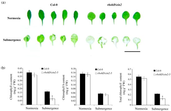 Chlorophyll content of wild-type plants and rbohD/ein2-5 double mutants after submergence stress. (a) Phenotype of 7-day-old wild-type plants (Col-0) and double mutant rbohD/ein2-5 leaves after treatment under normoxic conditions and submerged conditions for 12 d. Bar = 1 cm. (b) Contents of chlorophyll a, b, and total chlorophyll of 7-day-old seedlings after treatment under normoxic conditions and submerged conditions for 12 d. Values represent means ± SD from three biologically independent experiments. * p < 0.05, versus wild-type (Student’s t test).
