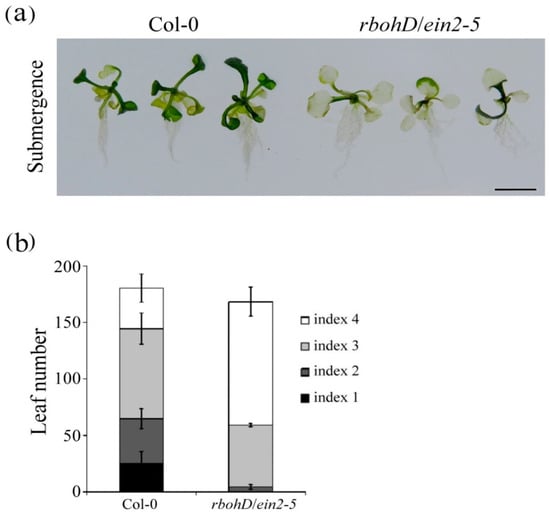 Sensitivity of the rbohD/ein2-5 double mutant to submerged conditions. (a) Phenotypes of 7-day-old wild-type plants and rbohD/ein2-5 double mutant seedlings after 12 d of submergence and 5 d of subsequent recovery. Bar = 1 cm. The photograph provides the results for three independent seedlings. (b) Quantification of the phenotype. Levels of damage were defined using an index based on the percentage of chlorotic leaves. Index 1 = 100% green leaves, Index 2 = over 50% green leaves, Index 3 = less than 50% green leaves, and Index 4 = 0% green leaves. The same results were obtained from three independent experiments (n ≥ 25).