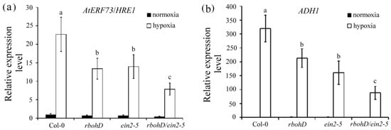 Transcript levels of hypoxia-inducible genes encoding AtERF73/HRE1 and ADH1 in rbohD/ein2-5 lines after hypoxia treatment. Total RNAs were isolated from roots of 14-day-old Col-0, rbohD, ein2-5, and rbohD/ein2-5 seedlings after 3 h of hypoxia treatment. Quantitative RT-PCR analyses of transcript levels of AtERF73/HRE1 (a) and ADH1 (b) genes. Values are means ± SD from three biologically independent experiments (n = 3). Values with different letters are significantly different at p < 0.05, according to a post-hoc LSD test.