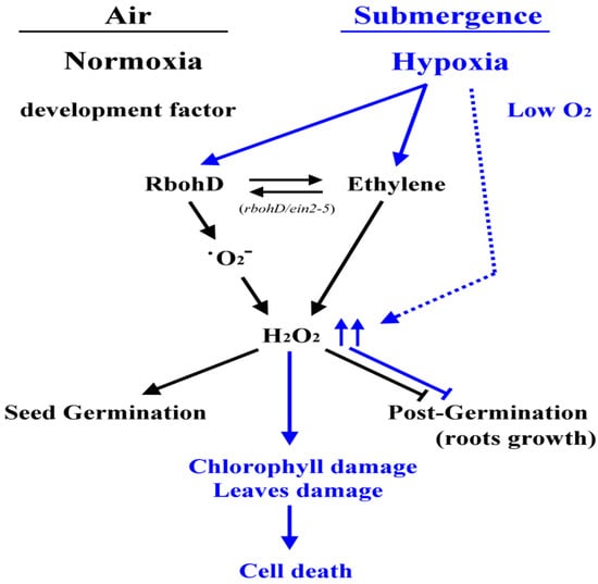 Schematic of the effects of RbohD-derived H2O2 and ethylene signaling under normoxic and hypoxic conditions. Both RbohD and EIN2 had a synergistic effect on seed germination and root growth at the postgermination stage under normoxic conditions (black line). Hypoxia triggers complex signaling pathways to increase the production of H2O2, leading to chlorophyll and leaves damages influencing submergence tolerance in Arabidopsis (blue line).