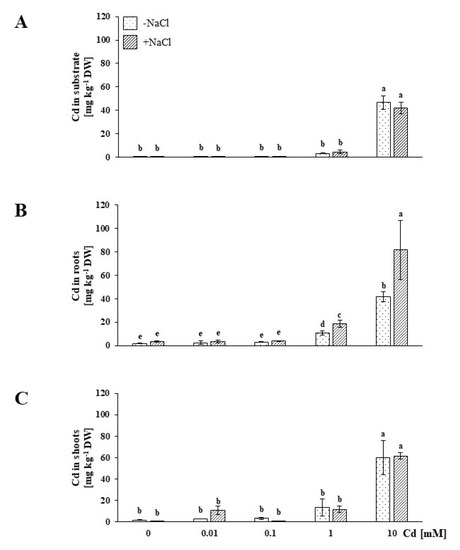 Contents measured in the substrate (A), roots (B) and shoots (C) of soil-grown NaCl-untreated (−NaCl) and salt-stressed (+NaCl) Mesembryanthemum crystallinum plants subjected to concentrations of 0.01, 0.1, 1, 10 mM Cd and the control (0.0 mM). Different letters above the bars indicate statistically significant differences at p ≤ 0.05 by Duncan’s post hoc test (N = 4, mean value ± SD).