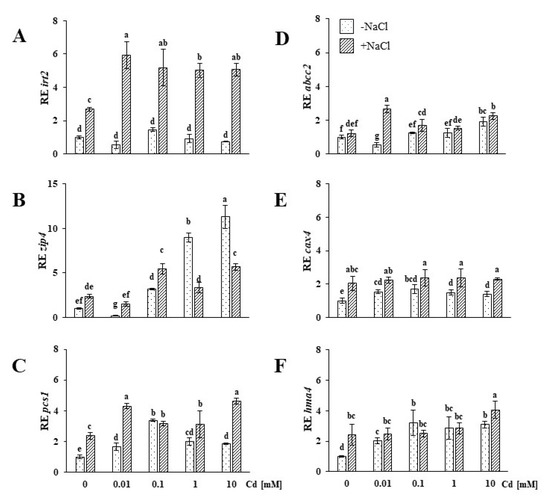Expression of iron-regulated protein 2, irt2 (A), zinc-induced protein 4, zip4 (B), phytochelatin synthase 1, pcs1 (C), ATP-binding cassette type c 2, abcc2 (D), cation exchanger 4, cax4 (E), and heavy metal ATPase 4, hma4 (F) genes in the roots of soil-grown NaCl-untreated (−NaCl) and salt-stressed (+NaCl) Mesembryanthemum crystallinum plants subjected to concentrations of 0.01, 0.1, 1, 10 mM Cd and control (0.0 mM). Different letters above the bars indicate statistically significant differences at p ≤ 0.05 by Duncan’s post hoc test (N = 4, mean value ± SD).