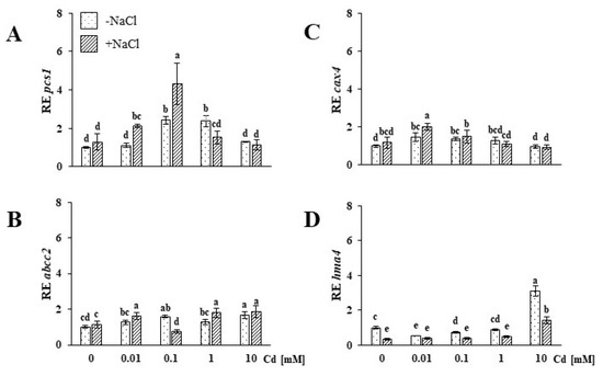 Expression of phytochelatin synthase 1, pcs1 (A), ATP-binding cassette type c 2, abcc2 (B), cation exchanger 4, cax4 (C), and heavy metal ATPase 4, hma4 (D) genes in the shoots of soil-grown NaCl-untreated (−NaCl) and salt-stressed (+NaCl) Mesembryanthemum crystallinum plants subjected to concentrations of 0.01, 0.1, 1, 10 mM Cd and control (0.0 mM). Different letters above the bars indicate statistically significant differences at p ≤ 0.05 by Duncan’s post hoc test (N = 4, mean value ± SD).