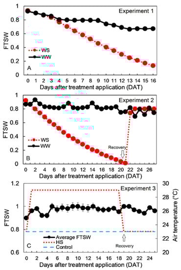 Environmental conditions for Experiment 1, 2, and 3 (A–C, respectively). In A, black dots represent fraction of transpirable soil water (FTSW) of well-watered (WW) plants while red dots represent FTSW for water stress (WS) plants over a 16-day experimental period (n = 50). In B, black dots represent FTSW of WW plants while red dots represent FTSW for WS plants over a 27-day experimental period (n = 60). From days after treatment application (DAT) 22, WS plants were subjected to a recovery period. In C, black dots represent the average FTSW evaluated on three average pots per treatment (n = 30), the red dotted line represents the average day-time air temperature of the heat stress (HS) chamber and the blue line represents the average day-time temperature of the control temperature (CT) chamber.