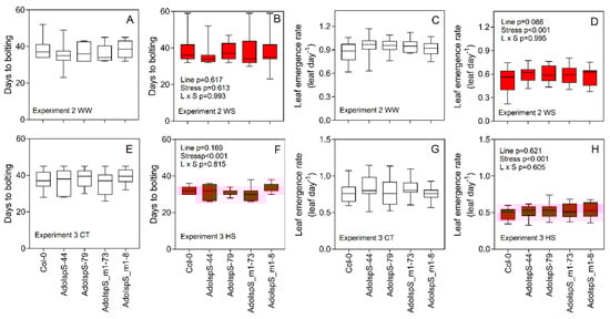Days to bolting and the leaf emergence rate assessed in Experiment 2 (A–D) and 3 (E–H). For all the graphs, black bars represent the control (either WW or CT) conditions, whereas red bars represent plants subjected to stress (either WS or HS) (n = 12). Data were analyzed with two-way ANOVA and the output is included in the graph. Means separation was carried out with Fisher’s test (since no differences are present between lines, the respective letters were omitted for simplicity).