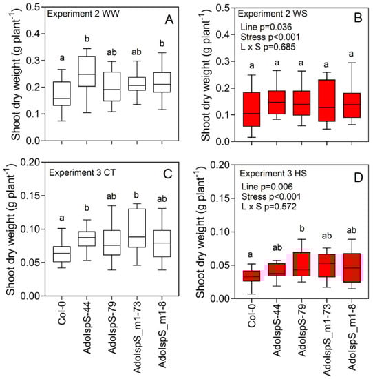 Shoot dry weight for Col-0, isoprene emitters (AdoIspS-44 and AdoIspS-79), and ocimene emitters (AdoIspS_m1-73 and AdoIspS_m1-8) Arabidopsis lines grown under control and stress conditions. In Experiment 2 (A,B), plants were grown under control (A) and water stress conditions (B) while in Experiment 3 (C,D), plants were grown under control (C, 23 °C temperature) and heat stress conditions (D, 29 °C temperature) (n = 12). The two-way ANOVA output is shown in the graph. Different letters represent significant differences according to Fisher’s test.