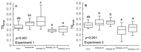 Breakpoint of plant transpiration to reduced soil water availability (TRbreak). Data were gravimetrically collected in Experiment 1 (A) and 2 (B) and daily plant transpiration was plotted against FTSW curves and subjected to segmented regression (n = 10 in A and n = 12 in B). Data were analyzed with one-way ANOVA and different letters represent significant differences according to Fisher’s test.