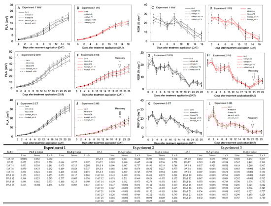 Projected leaf area (PLA) and relative growth rate (RGR) of Col-0 and isoprene- or ocimene-emitting lines. Data were collected over three experiments and during the entire experimental treatment. In (A,E,I), continuous assessment of PLA for control plants (WW in Experiment 1 and 2 or CT in Experiment 3) and in (C,G,K), the calculated RGR is shown. In (B,F,J), continuous assessment of PLA for stressed plants (WS in Experiment 1 and 2 or HS in Experiment 3) and in (D,H,L), the calculated RGR is shown. Values are means ± standard error of the means (n = 12 while n = 10 in Experiment 1). Data were subjected to repeated measurements analysis (p < 0.001) and two-way ANOVA and the output is shown in the table for each experiment. A multiple comparisons test (Fisher’s test) was carried out for each day after treatment (DAT) and is shown in Supplementary 2 for simplicity.
