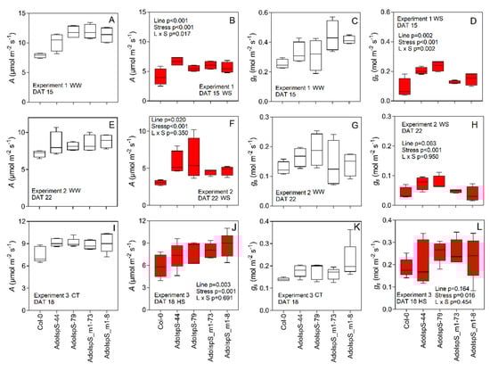 CO2 assimilation rate (A) and stomatal conductance (gs) collected in Experiment 1 (A–D), Experiment 2 (E–H), and Experiment 3 (I–L). Values are means (n = 4 to 5) and the two-way ANOVA output is shown in each graph. Measurements (n = 4 to 5) were performed at 600 μmol m−2 s−1 PAR, 23 °C leaf temperature, and 400 μmol mol−1 [CO2] in Experiment 1 and 2 (water stress experiments) while in Experiment 3 (heat stress experiment), the block temperature was 23 and 29 °C for CT and HS, respectively.