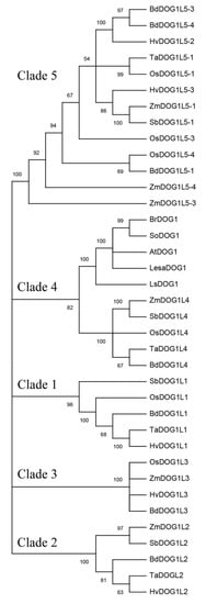 Phylogenetic tree of DOG1. Deduced DOG1 and DOG1-like amino acid sequences of Arabidopsis thaliana (AtDOG1, AtDOGL1-5); deduced DOG1 amino acid sequences of Brassica rapa (BrDOG1), Lactuca sativa (LsDOG1), Lepidum sativum (LesaDOG1), Sisymbrium officinale (SoDOG1); and the homologs in cereals Brachypodium distachyon (BdDOG1L1 to L5), Hordeum vulgare (HvDOG1L1, L2, L3, and L5), Oryza sativa (OsDOG1L1, L3, L4, and L5), Sorghum bicolor (SbDOG1L1 to L5), Triticum aestivum (TaDOG1L1, L2, L4, and L5), and Zea mays (ZmDOG1L2 to L5) were included. Tree was constructed with the neighbor joining method (1000 bootstrap repetitions) using MEGA X software. Only branches with a value above 50% are shown. An additional table indicates the accession numbers of the sequences included in the tree (Figure S1 and Table S1).