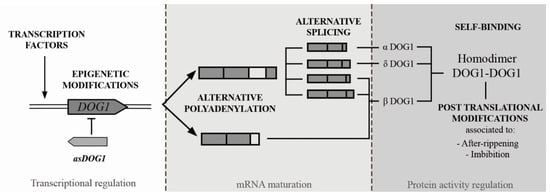 Different molecular mechanisms regulating the gene expression and protein activity of DOG1. The transcription of DOG1 is regulated by epigenetic modifications and probably by TFs. Additionally, the transcription of a noncoding antisense sequence (asDOG1) acts as a negative regulator of DOG1 expression. Two different precursor mRNAs are formed due to the existence of two polyadenylation sites in Arabidopsis. The precursor mRNAs are processed to five different mature mRNA by alternative splicing and lately translated to three different protein isoforms (three of the five mRNA encode the same protein isoform). DOG1 binds itself to form homodimers and can suffer post-translational modifications associated to AR and germination processes. However, the specific nature of these modifications is still unknown.