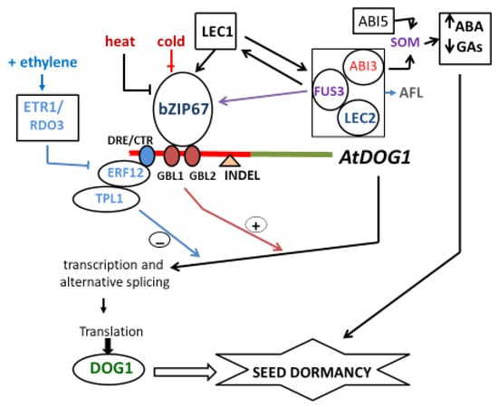 Although knowledge of DOG1 has advanced considerably in recent years, it is not known meticulously which TFs bind to the DOG1 promoter and are responsible for driving its expression during embryo maturation. Since the amount of DOG1 accumulated in the dry seed determines the storage time necessary to release PD, the regulation of DOG1 transcriptional activity by ABI3, FUS3, LEC1, and LEC2 is an exploration that should be considered in detail. DOG1 expression is known to rely indirectly on LEC1, a member of the HAP3 family [,,]. However, LEC1 has no direct interaction with DOG1 promoter (Figure 3). In lec1 mutants, the gene activity of DOG1 is reduced. ABI3, FUS3, and LEC2 (known as AFL as a whole) contain a B3 DNA-binding domain (special to plants) that specifically recognizes RY [CATGCA(TG)] motif present in the promoter region of many maturation-related genes [,,]. A RY motif is present in the promoter of AtDOG1, and its transcriptional pattern in seed development indicates that DOG1 is very likely regulated by at least one of above TFs []. In the attempt to identify some TF with affinity for the DOG1 promoter, it was perceived in soybean (Glycine max) that bZIP67 is a regulator of several genes involved in SSPs deposition []. In other words, DOG1 encodes a plant specific protein with a domain shared by bZIP. Progressing in this approach, quite recently the Eastmond’s group proved in a solid work that bZIP67 acts downstream LEC1 to transactivate DOG1 during seed maturation helping to establish PD in Arabidopsis []. Eastmond in his work demonstrated that: (i) bZIP67 is required for DOG1 expression and DOG1 accumulation; (ii) probably, bZIP67 and DOG1 functionally belong to same pathway; (iii) bZIP67 may contribute to the regulation of PD through the control of DOG1 expression; (iv) DOG1 is induced by LEC1; this fact occurs after the induction of bZIP67; (v) in vivo and in vitro experiments propose that bZIP67 binds to the promotor of DOG1 by GBL cis-element; (vi) cool conditions during seed maturation enhances bZIP67 amount but not bZIP67-mRNA []. Together, bZIP67 is a direct regulator of DOG1 expression, specifying the LEC1 action in the establishment of PD (Figure 3).