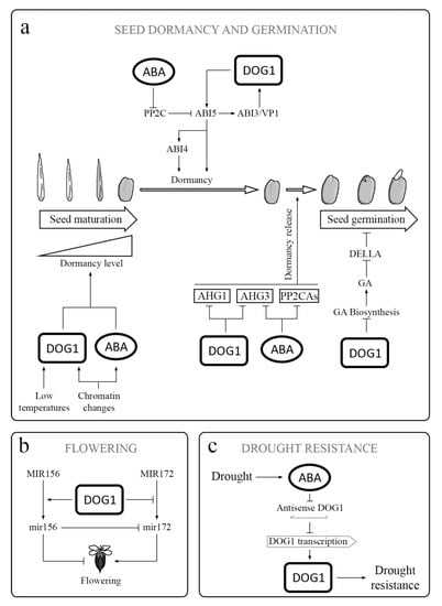 DOG1 in different physiological processes: (a) DOG1 has an influence on several genes involved in ABA signaling, including ABI3 and ABI5. Thus, it acts together with ABA in the regulation of the acquisition, maintenance, and release of PD. DOG1 also inactivates AHG1 and AHG3, which are the key negative regulators in ABA signaling. The inactivation of AHG1 and AHG2 results in release of PD. Additionally, DOG1 reduces the GAs biosynthesis during germination. (b) DOG1 participates in the regulation of flowering by influencing the transition from primary MIR156 and MIR172 to active miR156 and miR172 through an effect on expression of genes involved in miRNA processing. Both active miRNAs are regulators, not only of flowering but also of PD and seed and seedling development. (c) Under drought conditions, the ABA content increases. The expression of DOG1 enhances the drought tolerance in vegetative tissues, and asDOG1 transcription is ABA repressed. asDOG1 acts as a negative regulator of DOG1 transcription.