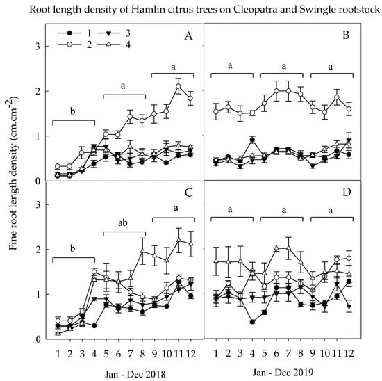 Root length density dynamics of citrus tree cv. Hamlin budded on Cleo (A,B) or Swc rootstocks (C,D) during spring (Jan.–May), summer (Jun.–Sep.), and fall (Oct.–Dec.) of 2018 and 2019 growing seasons. Treatments: untreated Control (1), full Ca dose (2), full Mg dose (3), and half Ca and half Mg doses (4), (full dose = 45 kg ha-1). The average seasonal FRLD are the mean values of (n = 8 trees) ± standard error of the mean (SEM).