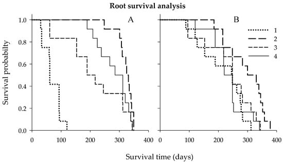 Kaplan–Meier root survival (lifespan) curve for citrus trees cv. Hamlin budded on Cleo (A) or Swc (B) rootstocks during the 2018 and 2019 growing seasons. Treatments: untreated control (1), full Ca dose (2), full Mg dose (3), and half Ca and half Mg doses (4), (full dose = 45 kg ha−1).