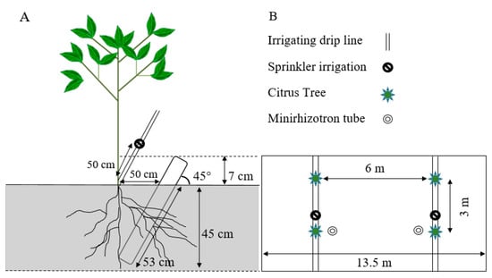 Schematic presentation of the citrus tree, minirhizotron tube, and irrigation sprinkler set up side view (A) and top view (B) of 13.5 m-wide bed, 6 m and 3 m spacing between rows and trees, respectively. The minirhizotron was located on the raised two-row beds and the sprinklers along the tree line at a right angle to each other from the tree and each 50 cm away from the trunk of the tree.
