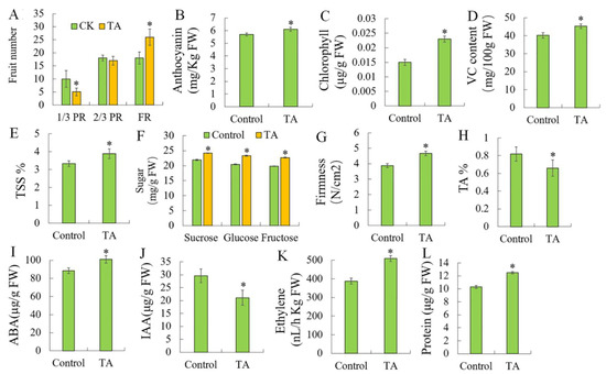 Figure 1. Effects of triacontanol on strawberry fruit ripening. (A). Fruit number. (B). Anthocyanin content. (C). Chlorophyll content. (D). VC (vitamin C) content. (E). TSS % (total soluble solid). (F). Sugar content. (G). Firmness. (H). TA %. (I). ABA (abscisic acid) content. (J). IAA (indoleacetic acid) content. (K). Ethylene content. (L). Protein content. Control: CK; TA: triacontanol. Vertical bars represented standard deviations (SD) of means (n = 3). Asterisks indicated statistically significant differences at p < 0.05 as determined by Student’s t-test.