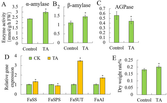 Figure 2. Effects of triacontanol on sugar metabolism. Enzyme activities of (A). α-amylase. (B). β-amylase. (C). AGPase. (D). Relative gene expression. (E). Dry weight rate%. Vertical bars represented standard deviations (SD) of means (n = 3). Asterisks indicated statistically significant differences at p < 0.05 as determined by Student’s t-test.