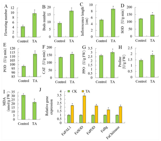 TA also affected the fruit development. TA increased the number of flowers per fruit (Figure 3A), such that the water-treated plants had an average of 4.3 flowers per plant, and the TA-treated plants had 9.7, and the number of buds (Figure 3B) and the inflorescence length (Figure 3C) were also increased. TA protected the fruit from external damage through increased enzyme activities, such as superoxide dismutase SOD (Figure 3D), peroxidase POD (Figure 3E), catalase CAT (Figure 3F) and polyphenol oxidase PPO (Figure 3G). The stress-related genes, FaPAL, FaSOD, FaPOD, FaBg and FaChitinase were also increased by TA (Figure 3J). Meanwhile, TA increased the proline content (Figure 3H), but decreased the malondialdehyde MDA content (Figure 3I). These suggested that TA plays an important role in maintaining the integrity of membrane structure, eliminating free radicals and alleviating membrane lipid peroxidation injuries. It can alleviate and improve the adaptability of plants to adversity.