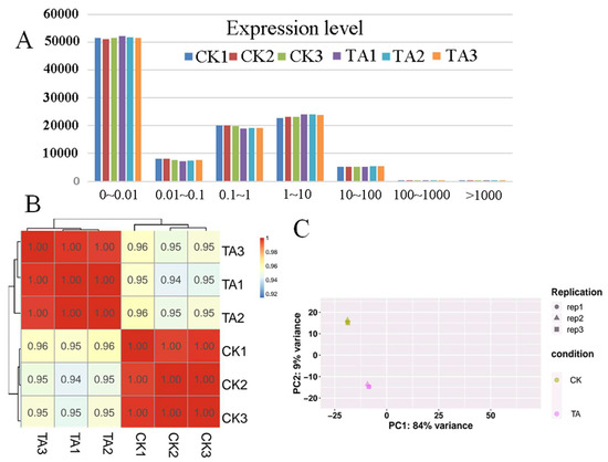 Figure 4. Different treatment samples analysis. (A). The calculation of expression level in strawberry fruit under TA (triacontanol) treatment. A total of 108,087 genes were identified and the number of genes in different sections were similar among both control and TA-treated. (B). Correlation matrix showed the correlation between samples. Both the CK (control) and TA-treated had the darkest colors, indicating that the correlation between the same treatment samples was the highest. (C). Principal Component Analysis (PCA) were performed on the biological replicates of each sample set (CK and TA), which the same treatment samples were closed, indicating the higher similarity between samples.
