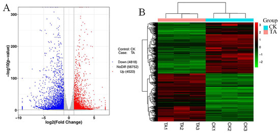 DESeq was used for differential analysis of gene expression, and the conditions for screening differentially expressed genes were: multiple of expression difference | log2FoldChange | > 1 and significance p-value < 0.05. Among all the detected 66,090 genes (Supplementary Materials Table S3), the expression levels of 56,752 genes were not significantly changed, and 9338 genes were differentially expressed under the action of TA, of which 4520 genes (48.40% of 9338) were up-regulated and 4,818 genes (51.60% of 9338) were down-regulated, respectively. The volcanic map of the differentially expressed genes was drawn using the R ggplots2 software package to further analyze the distribution of DEGs (Figure 5A), showing the fold difference of gene expression and significance of results. From the figure we got that the distribution of up-regulated and down-regulated genes was roughly symmetrical. We also used the R language Pheatmap package to perform a two-way cluster analysis on the union and samples of the differential genes of all the comparison groups (Figure 5B). The expression pattern of differentially expressed genes was under different experimental conditions to explore unknown biological connections between genes.