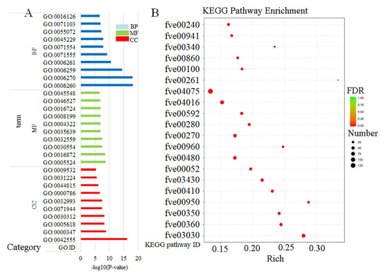 Among all KEGG pathways, the first six pathways containing the most DEGs were “Plant hormone signal transduction” (fve04075), “Phenylpropanoid biosynthesis” (fve00940), and “Plant-pathogen interaction” (fve04626), “Protein processing in endoplasmic reticulum” (fve04141), “MAPK signaling pathway-plant” and “Starch and sucrose metabolism” (fve00500). The first six pathways with the most significant enrichment (with the lowest FDR value) were DNA replication (fve03030), Phylnalanine metabolism (fve00360), Tyrosine metabolism (fve00350), Isoquinoline alkaloid biosynthesis (fve00950), Mismatch repair (fve03430), and beta-Alanine metabolism (fve00410). The top 20 KEGG pathways with the most significant enrichment were now shown (Figure 6B).