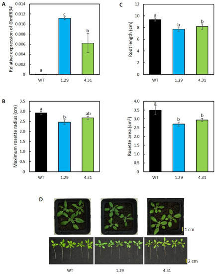 Transgene expression and phenotypic characteristics of Arabidopsis ectopically expressing GmRR34 (independent lines 1.29 and 4.31) under normal growth conditions. (A) Relative expression level of transgene in the ectopic expression lines using GmRR34-specific primers. Wild-type plants were used as the control sample (n = 3). (B) Maximum rosette radius and average rosette area (n = 10). (C) Root length (n = 10). (D) Overall rosette and primary root phenotypes. Error bars indicate standard errors. Statistically identified differences among three genotypes under the same treatment were indicated by different letters (p-value < 0.05).