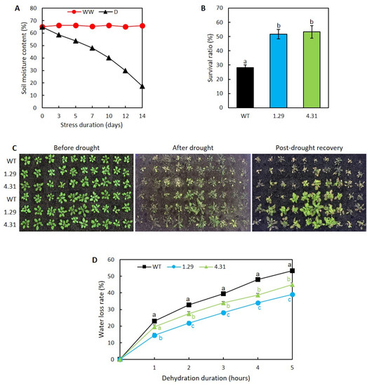 To evaluate the drought resistance mediated by the ectopic expression of GmRR34, drought treatment was applied to evaluate survival ratio of each genotype. After 14 days of water withholding (i.e., soil moisture content (SMC) dropped from 65% to 17%, Figure 2A), both transgenic lines demonstrated their remarkable drought resistance when compared with the WT’s capacity. After 3 days of re-watering, the survival ratios were 52% and 53% for ectopic overexpression lines 1.29 and 4.31, respectively, which were significantly higher than that of the WT (merely 28% survived) (Figure 2B,C). Additionally, examination of water loss rates from detached aerial tissues of transgenic Arabidopsis versus WT plants was conducted. As shown in Figure 2D, the results further illustrated the GmRR34-transgenic plants with better capability of retaining water over the course of dehydration treatment. According to our findings, the degrees of fresh weight (FW) reduction observed in both lines 1.29 and 4.31 were significantly lower than in WT at the same examined time points (e.g., water loss rate of 53% in WT compared with 39% in 1.29 and 45% in 4.31 upon 5-h-dehydration treatment). These results showed that line 1.29 displayed the lowest water loss rate (Figure 2D).