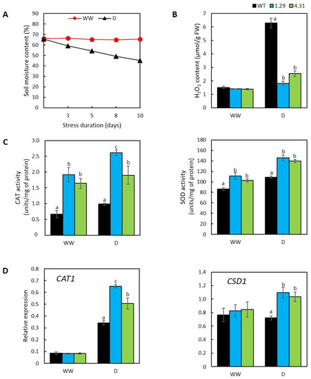 Endogenous level of hydrogen peroxide (H2O2) in WT and transgenic Arabidopsis was investigated to evaluate the degree of cellular damage caused by drought effects. According to our study, the WT plants exposed to drought displayed 3.5- and 2.5-fold higher levels of endogenous H2O2 than the corresponding levels measured in transgenic lines 1.29 and 4.31, respectively (Figure 3A,B). As antioxidative enzymes are known to be involved in the reactive oxygen species (ROS) detoxification process [15], we further examined the common ROS-scavenging enzymes catalases (CAT) and superoxide dismutase (SOD). The biochemical analyses demonstrated that the transgenic plants were better at detoxifying ROS than WT, since both lines 1.29 and 4.31 showed enhanced CAT and SOD activities, not only under drought but also well-watered conditions, in comparison with the corresponding enzyme activities in the WT (Figure 3C). Another notice was the more pronounced degree of SOD induction upon the stress application (increased by 31% in line 1.29 and 35% in line 4.31 versus 26% in WT). Additionally, our RT-qPCR results revealed the enhanced expression of genes coding for these enzymes. Relative expression levels of CAT- and SOD- encoding genes, CAT1 (catalase1) and CSD1 (copper/zinc superoxide dismutase 1) [37,38], were found to be substantially higher in the transgenic Arabidopsis when compared with the corresponding levels in the WT plants under the drought treatment (Figure 3D). Specifically, CAT1 expression was up-regulated by drought by 7.9-fold in line 1.29 and 6.1-fold in line 4.31 versus 3.9-fold in WT, whereas the induction levels in expression of CSD1 upon the stress challenge were 1.3-fold (line 1.29) and 1.2-fold (line 4.31) compared with 0.9-fold in WT.