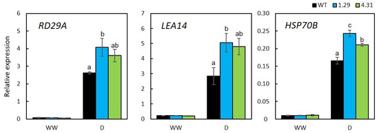 Relative expression of drought-responsive genes AtRD29A, AtLEA14 and AtHSP70B under well-watered (WW) and 10-day-drought (D) conditions in wild-type (WT) and transgenic plants ectopically expressing GmRR34 (independent lines 1.29 and 4.31). Three biological replicates were used for each genotype under the same treatment, and statistically identified differences among them were indicated by different letters (p-value < 0.05). Error bars indicate standard errors.