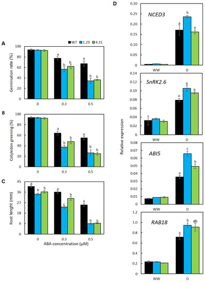 Plants were cultivated on MS medium without ABA and with ABA at concentration of 0.3 or 0.5 µM under normal growth conditions. To figure out the germination rates, the seeds with emerged radicles within the examined population were counted after 2 days of stratification followed by 3 days of incubation. To determine the rates of successful cotyledon development, seedlings with green cotyledons were counted after 7 days of incubation. These procedures were performed using methods described in previous study [101]. Each experiment was triplicated, with 100 seeds per replicate. For evaluation of root elongation, seeds of WT and transgenic lines were germinated on MS medium and allowed to grow for 4 days. After that, the seedlings were transferred to MS plates, supplemented with different concentrations of ABA (0, 0.3, and 0.5 µM) and let grow vertically for 8 days prior to the measurement of root length [102]. Ten biological replicates were used for each genotype for determining of root growth capacity under ABA treatment.