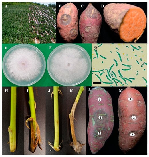 - Yang, J.W.; Nam, S.S.; Lee, H.U.; Choi, K.H.; Hwang, S.G.; Paul, N.C. Fusarium root rot caused by Fusarium solani on sweet potato (Ipomoea batatas) in South Korea. Can. J. Plant Pathol. 2018, 40, 90–95. [Google Scholar] [CrossRef]