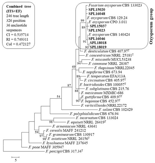 A maximum parsimony (MP) phylogenetic tree was constructed for the combined datasets of the ITS and EF-1α gene sequences. Furthermore, 1000 bootstrap replication was applied, and the percentage of replicate trees in which the associated taxa clustered together in the bootstrap test is shown next to the branches (Figure 2). Bootstrap values below 50% were deleted. Parsimony analysis (MP) of all sequences produced a single clade of the present study isolates (SPL15020, SPL15023, SPL15037, SPL16046, SPL16048, SPL18018, and SPL18019) with reliable references of F. oxysporum sequences and with a high bootstrap value. The isolates from wilt and surface rot diseases were not separated in the tree. Isolates SPL15020 (wilt pathogen) and SPL16048 (surface rot pathogen) were in a subgroup with F. oxysporum CBS 133023 and CBS 129.24. Isolates SPL15037 and SPL15023 were in the same subgroup with F. oxysporum CPO 3.011. The remaining isolates (SPL16048, SPL18018, and SPL18019) showed similarity with the reliable references of F. oxysporum CBS 140424. The sequences used in constructing phylogenetic trees were reliable and published, and some are type strains and came from authentic sources to the GenBank. Combined sequence analysis confirmed the present study isolates as F. oxysporum (Figure 2).