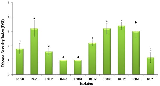 Virulence experiment conducted on stems of sweetpotato by 10 different isolates obtained in the present study. Disease severity index of the isolates is shown to choose the most virulent pathogenic isolate. Disease severity index (DSI) was measured by a 0–5 scale. 0 = seedlings grew normally without visible symptoms; 1 = ~5% browning and cracking in the vascular bundle; 2 = ~25% browning and cracking, 3 = ~25% browning and cracking in vascular bundle length and yellowing of the bottom leaves; 4 = browning of the entire vascular and discoloration of all the leaves; 5 = seedling collapsed and died. Different lowercase letters in the figure indicates the level of significance at p < 0.05 by Tukey’s test.