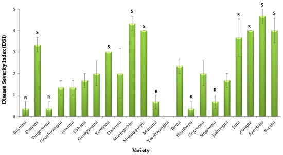 After selecting the most virulent pathogen (SPL18019), disease-resistant variety selection experiment was conducted on 21 well-known sweetpotato varieties in Korea: Jinyulmi, Danjami, Pungwonmi, Geonhwangmi, Yesumi, Dahomi, Geonpungmi, Yeonjami, Daeyumi, Morning white, Morning purple, Matnami, Yeonhwangmi, Biomi, Healthyumi, Gogeonmi, Singeonmi, Jinhongmi, Jami, Jeungmi, and Annobeni. The pathogen inoculation experiment was conducted by following the method described above in the previous paragraph for the virulent pathogen. On the basis of symptoms, a disease severity index was established and categorized using a 0-to-5 scale. Categories were as follows: 0 = seedlings grew normally without visible symptoms; 1 = ~5% browning and cracking in vascular bundle length; 2 = ~25% browning and cracking, 3 = ~25% browning and cracking in vascular bundle length and yellowing of the bottom leaves; 4 = browning of the entire vascular and discoloration of all the leaves; 5 = seedling collapsed and died []. The final disease index (DI) was calculated using the following formula: