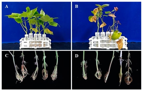 The disease reaction of the selection for evaluation of resistance to F. oxysporum SPL18019. Here, the photograph shows the control (A,C; no visible symptoms) and pathogen-infected (B, leaf yellowing; D, yellowing and cracking root tissues) of the Annobeni variety.