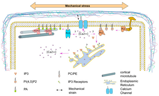 A phospholipase D (PLD) dependent synthesis of phosphatidic acid (PA) was shown to play an important role in cortical microtubule (cMT) bundling in response to salt stress. Phosphatidyl ethanolamine (PE) and phosphatidyl choline (PC) gets hydrolyzed by PLDα1 to PA, hereby activating the MICROTUBULE-ASSOCIATED PROTEIN 65-1 (MAP65-1). A similar mechanism might also be involved in response to mechanical stress. The PLD protein family consist in Arabidopsis of 12 members, that can be classified by their N-terminal domains into the Ca2+ activated C2-PLDs and the PX/PH-PLDs [85]. Opening of mechanosensitive Ca2+ channels might lead to the activation of C2-PLDs, hereby regulating cMT dynamics. A comparable system could also be involved in the activation of the phospholipase C (PLC) family, as earlier studies indicate that the PLCs might be activated by Ca2+ in plants. It was also shown that PLCs are activated by cell surface receptors in mammalian cells. A similar mechanism is thought to also be involved in plants. The PLCs hydrolyze PI(4,5)P2 to inositol triphosphate (IP3). IP3 is a known signaling molecule, that can be further phosphorylated to inositol pyrophosphates, which can fulfill different functions as signaling molecules [86]. In animals, IP3 is recognized by IP3-receptors at the endoplasmic reticulum leading to an intracellular Ca2+ spike. Earlier studies indicate, that there might be a similar system in plants.
