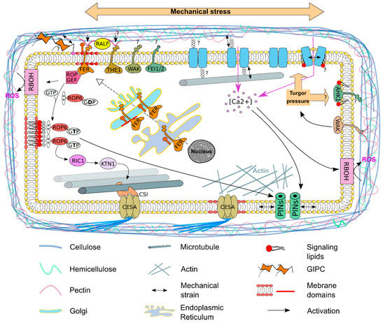 Role of the plasma membrane in mechano-sensing. Mechanical stress can modify the composition and/or organization of the cell wall. This may be perceived by transmembrane receptor kinases such as FERONIA (FER), THESEUS1 (THE1), WALL-ASSOCIATED KINASE (WAK) and FEI1 - FEI2 receptor-like kinases. Localization of FER in membrane domains may be done thanks to the interaction with LLG1, a glycosyl-phosphatidylinositol-anchored protein synthetized in the endoplasmic reticulum and localized in membrane domains in the Golgi. Selective opening of stretch-activated channels can open when a mechanical tension is pulling them (this implies they have to be anchored outside and/or outside the cell by an unknown mechanism represented by a spring) or by a modification of the membrane tension, that may be regulated by the membrane curvature and a specific lipid composition of the plasma membrane. Another hypothesis is that long decoration present in complex lipids such as Glycosyl Inositol Phospho Ceramides (GIPC) that can be formed by up to 14 sugars will interact with the cell wall and create a physical link between the lipid bilayer and the cell wall. Turgor pressure may potentially be perceived by ARABIDOPSIS HISTIDINE KINASEs (AHK) 1. Channel opening leads to an increase of calcium concentration ([Ca2+]) that activates respiratory burst oxidase homologues (RBOH) that will produce reactive oxygen species (ROS). Ca2+ is also needed for PIN1 relocalization in response to mechanical stress. Accumulation at the plasma membrane of RHO OF PLANT (ROP) 6 is activated by ROP-GEF that interacted with FER. ROP6 localization into membrane domains is driven by positive stretch that interact with the negatively charged signaling lipids. ROP6 can activate ROP-interactive CRIB motif-containing protein 1 (RIC1) and promotes KATANIN1 (KTN1) dependent parallel ordering of cMT. Cellulose synthase interactive protein 1 (CSI1) acts as a linker protein between CESA complexes and microtubules. Plasma membrane localization of the CESA and PINs is at least partially regulated by actin cytoskeleton.