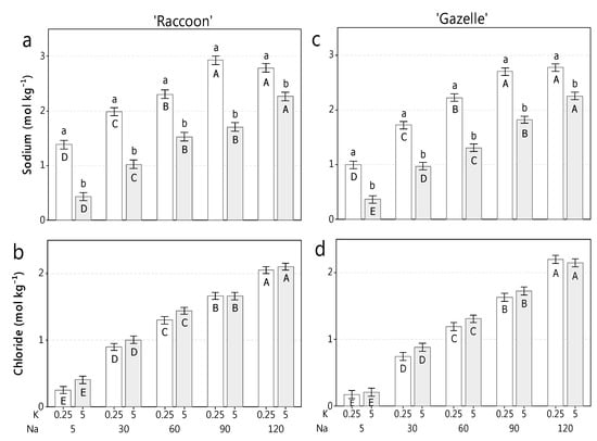 Shoot Cl increased 8-fold from 0.25–2.0 mol kg−1 (9–72 g kg−1) in ‘Raccoon’ and 13-fold (0.17–2.2 mol kg−1 or 6–78 g kg−1) in ‘Gazelle’ at 0.25 K, while at 5.0 K shoot Cl increased 5.3-fold from 0.4–2.1 mol kg−1 (14–74 g kg−1) in ‘Raccoon’ and 9.5-fold (0.22–2.14 mol kg−1 or 8–76 g kg−1) in ‘Gazelle’ (Figure 1b,d). Unlike Na, Cl absorption did not diminish with increased K and, at the highest salinity level, averaged 2.06 mol kg−1 (73 g kg−1) in ‘Raccoon’ and 2.17 mol kg−1 (77 g kg−1) in ‘Gazelle’. Neither cultivar showed a difference in Cl accumulation under 0.25 K or 5.0 K, regardless of potassium dose (Figure 1b,d).