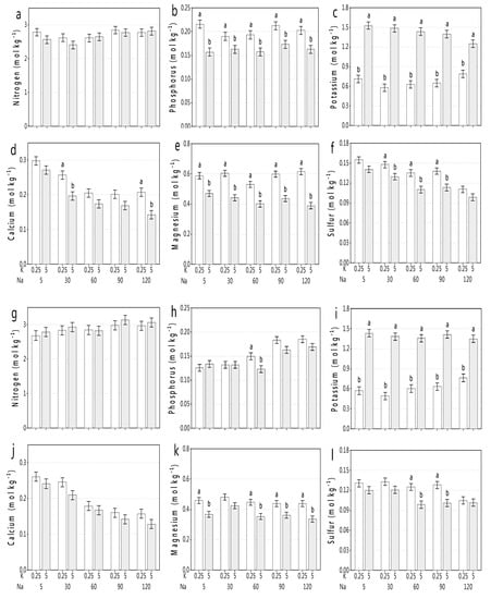Ion concentrations of shoot macronutrients in two spinach cultivars grown under different salinity (Na) and potassium (K) treatments. ‘Raccoon’ shoot concentrations of N (a), P (b), K (c), Ca (d), Mg (e), and S (f) and ‘Gazelle’ shoot concentrations of N (g), P (h), K (i), Ca (j), Mg (k), and S (l). Means followed by different letters show significant differences between K doses in each Na dose by Fisher’s LSD test (p < 0.05).