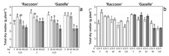 Total dry biomass (roots + shoots) of ‘Raccoon’ and ‘Gazelle’ spinach plants cultivated in a greenhouse and irrigated with saline waters. (a) Total biomass response to salinity within each K dose. (b) Total biomass response to K doses within each salinity level. Bars followed by the same letter are not different within each K (a) or NaCl (b) doses, according to Fisher’s LSD test (p < 0.05).