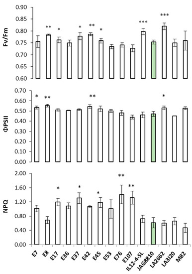 Maximum quantum yield of photosystem II (PSII) (Fv/Fm), effective quantum yield of PSII (ΦPSII), and non-photochemical quenching (NPQ) measured on different tomato genotypes grown under a plastic walk-in tunnel. Bars are means ± standard error (n = 5). ANOVA with LSD post-hoc test was used to compare each genotype vs. the control genotype JAG8810 (green column). The asterisks indicate statistically significant differences at * p < 0.05; ** p < 0.01; *** p < 0.001.