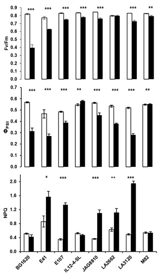 Maximum quantum yield of PSII (Fv/Fm), effective quantum yield of PSII (ΦPSII) and non-photochemical quenching (NPQ) in detached tomato leaves of different tomato genotypes following short term heat treatment for 60 min at 45 °C (solid bars), compared with the respective non-treated control (open bars). Bars are means ± standard error (n = 5). The asterisks indicate statistically significant differences (* p < 0.05; ** p < 0.01; *** p < 0.001) according to Student’s t-test.