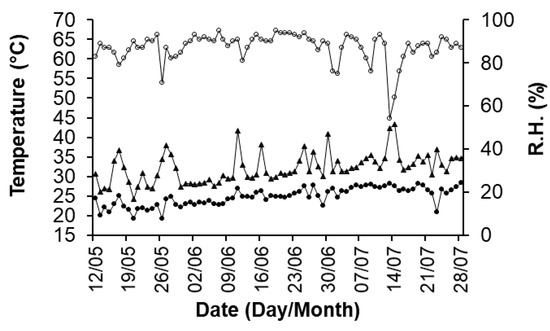 Relative humidity (R.H.; open symbols, right axis) and maximum and minimum air temperatures (solid symbols, left axis) during May–July 2017 inside a greenhouse in the experimental field at Battipaglia (Salerno, Campania region, Italy).
